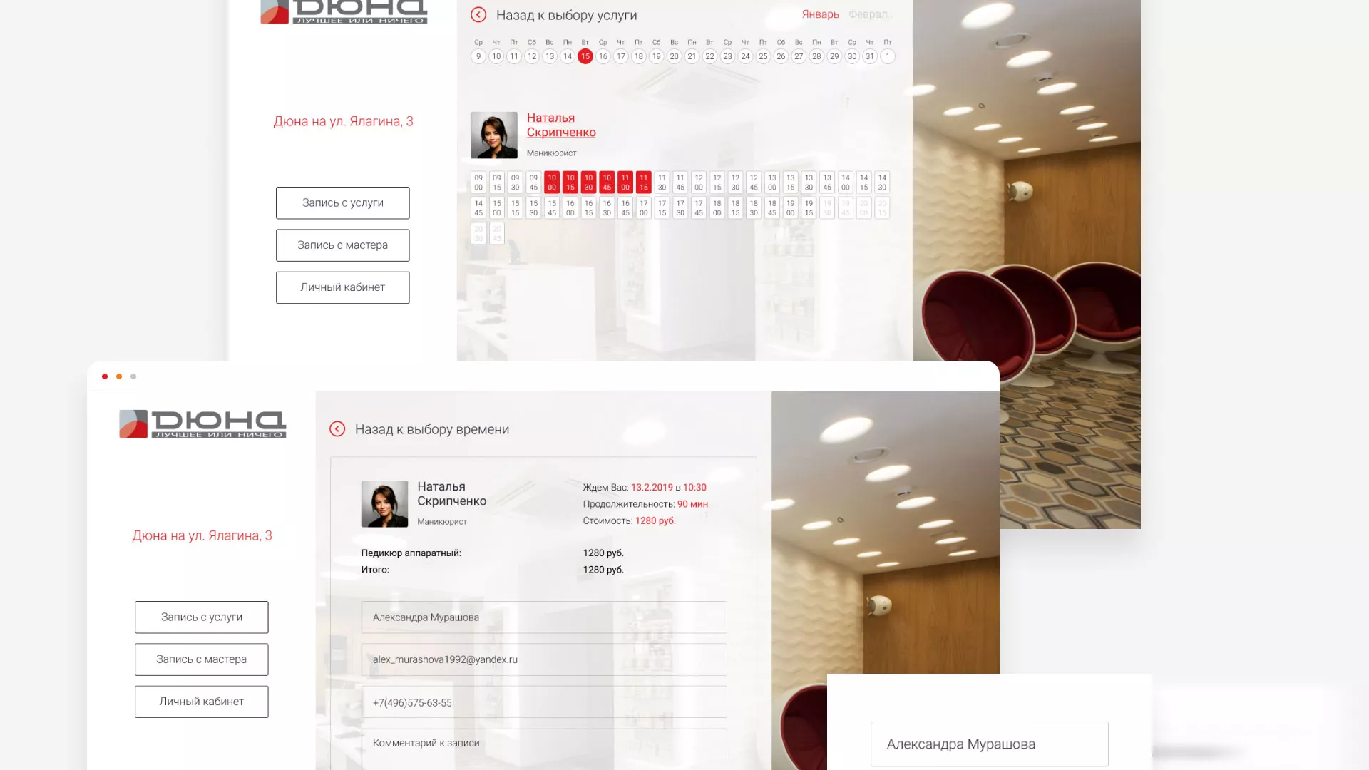 В разделе «Личный кабинет» содержатся все текущие записи в салоны красоты в Кронштадте, с возможностью их отмены. Также, здесь можно редактировать свои персональные данные, ознакомиться с историей записей и видеть бонусы и акции салонов красоты.